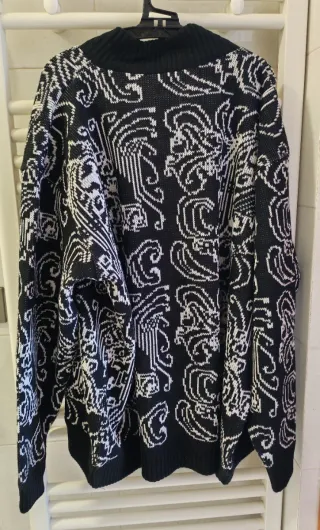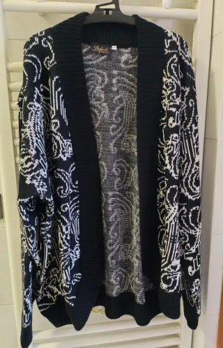 Cardigan da donna con un'originale fantasia bicolore. Il capo presenta un design aperto senza bottoni, perfetto per aggiungere un tocco di stile a qualsiasi outfit. - Fantasia geometrica e astratta. - Orlo e polsini a costine. - Vestibilità comoda. Taglia 5. Vintage. Lana e acrilico, caldo. Ampiezza spalle cm 56, lunghezza cm 74