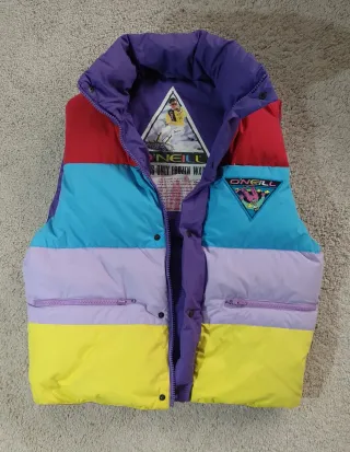 Giubbotto O'Neill colorato, perfetto per un look retrò. - Design a blocchi di colore vivaci. - Collo alto con chiusura a bottoni. - Tasche frontali con zip. - Logo O'Neill sul petto. Raro giubbotto vintage piumino smanicato O'Neill anni 80 in Perfetto stato taglia S /46 donna/uomo Manca il perno del cursore cerniera principale come da foto ma è funzionante