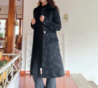Elegante cappotto vintage con un raffinato motivo floreale. - Realizzato in misto lana per un comfort ottimale. - Design lungo e classico, perfetto per ogni occasione. - Dettaglio di un bottone decorativo sul davanti. Presenta dei bottoni a scomparsa , di spalle misura 40 cm ed è lungo 100 cm partendo dalla base alta del collo