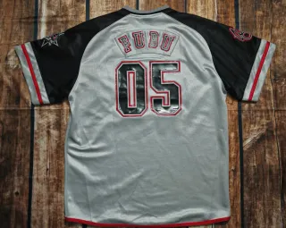 Maglia da baseball stile Brooklyn con numero 05. - Design con scollo a V. - Dettagli a contrasto arancioni e blu. - Patch sul petto e sulle maniche.