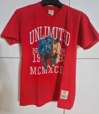 T-shirt rossa con stampa di un rinoceronte e scritte Rare vintage collezione 1972. Vestibilità regolare 47cm spalla spalla 47cm ascella ascella 65cm Lunghezza totale - Stampa Unlimited in alto. - Dettagli Red e DM 1993 MCMXCII. - Etichetta Ecko Unltd sul fondo.