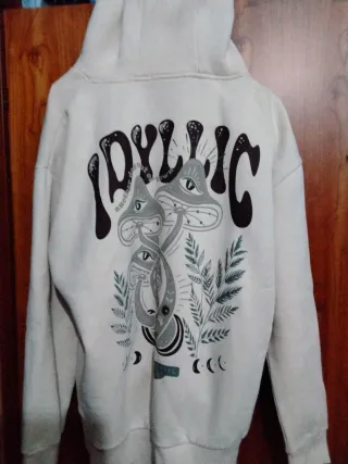 Vendo bellissima felpa con cappuccio, caratterizzata dalla stampa frontale "Idyllic" con grafica a forma di fungo in stile trippy/vintage. Perfetta per amanti dello stile indie, skate o streetwear rilassato. Colore: Beige Dettagli: Cappuccio regolabile con laccetti bianchi e punte nere a contrasto. Vestibilità: Comoda e calda, ideale per le mezze stagioni o l'inverno. Condizioni: Ottime