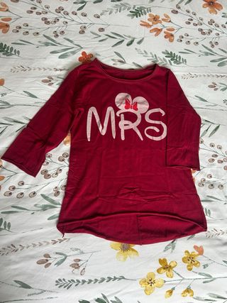 • Maglietta color bordeaux con stampa con orecchie di Minnie e scritta MRS • Manica a 3/4. Leggermente più lunga dietro • Taglia S, le misure sono visibili in foto • In ottime condizioni