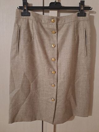 Gonna vintage lana con apertura centrale bottoni dorati e foderata all' interno. Lunghezza 58 cm, vita 37 cm, girovita 74 cm, fianchi 42 cm.