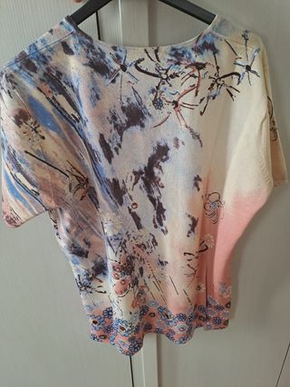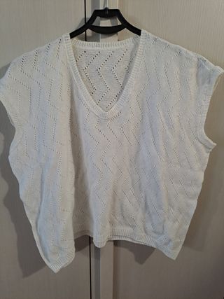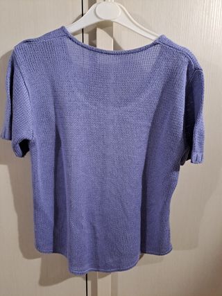 Maglia lavorata, maniche corte, scollo a V. Lunghezza 59 cm, spalle 44 cm, ascelle 51 cm, maniche 18 cm.