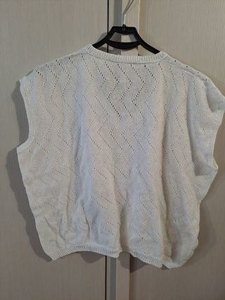 Cardigan taglia M lunghezza 52 cm, spalle 37 cm, ascelle 46 cm, maniche 51 cm. Top smanicato taglia L lunghezza 52 cm, ascelle 36 cm.