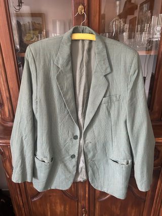 Giacca vintage da donna, con spalline imbottite e chiusura a bottoni .Tessuto a righe sottili con fodera. Lunghezza 60 cm, maniche 56 cm, spalle 43 cm, ascelle 52 cm. Non ha l'etichetta della composizione del tessuto.