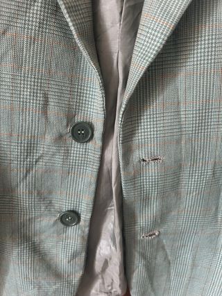 Elegante giacca vintage a motivo scozzese, colore verde con piccola righetta marroncina. Modello classico con spalline imbottite e due bottoni frontali e due bottoni sulle maniche. Tasche a fessura. Tessuto non specificato perche mancante di etichetta ma probabile misto lana. Ottime condizioni, nessun difetto evidente. lunghezza totale 72 cm circa, misura da spalla a spalla 44 cm. consiglio a taglia L, ideale con cintura in vita.