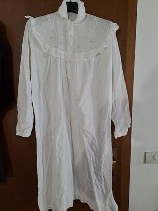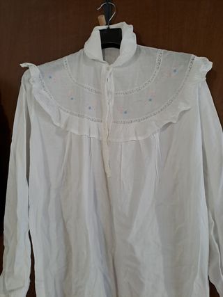 Camicia vintage da notte maniche lunghe chiuse con bottone, corpetto con pizzo e ricami floreali. Lunghezza 106 cm, maniche 52 cm, spalle 41 cm, ascelle 53 cm, vita 55 cm, girovita 110 cm, fianchi 58 cm. Non ha etichetta.