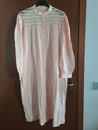 Camicia vintage cotone da notte maniche lunghe, pizzo sullo scollo. Non ha etichetta. Lunghezza 98 cm, spalle 43 cm, ascelle 54 cm, maniche 57 cm, seno 55 cm, vita 56 cm.