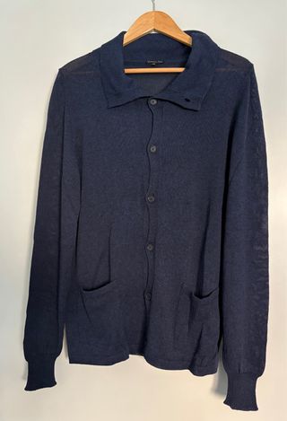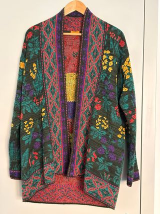 Cardigan vintage con collo con maglia, chiusura con cinturino, orlo assimetrico a punta. Lunghezza 67 cm, lunghezza punta 79 cm, spalle 39 cm, ascelle 46 cm, maniche 56 cm.
