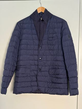 Giacca pari al nuovo Double face, lato esterno in tipico piumino a salsicciotto, lato interno liscio. Colore blu 100% piumino d'oca Misure: spalle 44 cm, lunghezza 70 cm Prezzo di listino: 290 euro No Allegri Aspesi mono petto doppio petto giacca classica parka giubbotto Cappotto Montgomery doubleface Casual vintage piuma blazer risvoltabile
