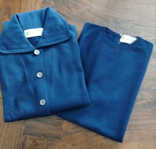 Coppia di gemelli lana(non si allega l'etichetta dell'esatta composizione in quanto assente),vintage ma..NUOVI,blu scuro(piu' scuro di quello delle foto),il maglioncino sotto ha le mezze maniche,spalle:52 cm,lunghezza:55 cm.Molto interessante.Pezzi unici!
