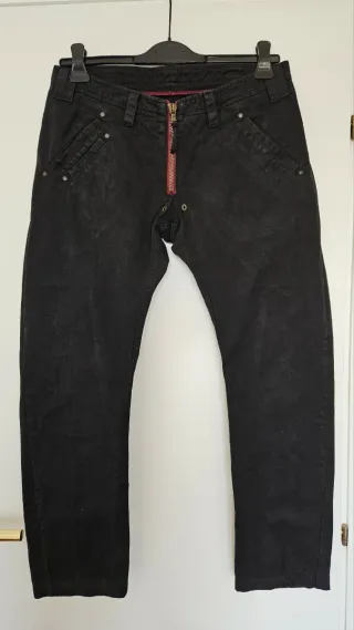 Brian Dales strepitoso jeans denim nero vintage tg. M 48IT. Iconico modello sexy rock con chiusura lampo a contrasto a tutta altezza senza bottone in vita, tasche frontali e posteriori, occhielli prendi aria al cavallo. In ottime condizioni, la tasca interna destra presenta uno strappo agevolmente ricucibile. Misure in cm: vita 43 girovita 91 cavallo davanti 21 cavallo dietro 36 coscia max 32 gamba esterna 103 gamba interna 78 fondo 20.