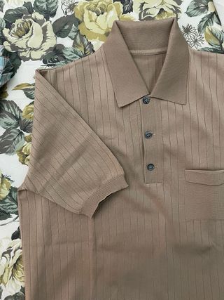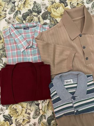 Set di abbigliamento vintage da uomo composto da quattro capi. - Camicia a quadri con bottoni. - Polo beige a coste. - Maglioncino bordeaux. - Polo a righe blu, verdi e bianche.