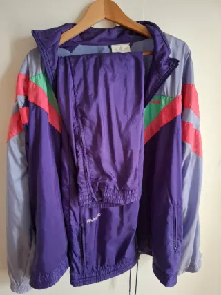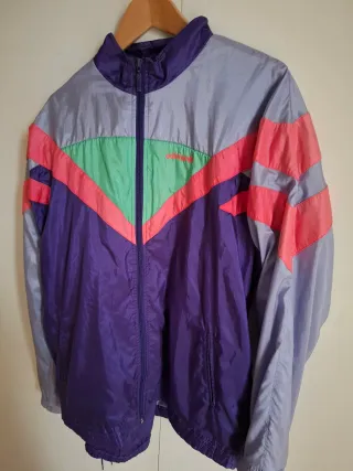 Tuta Adidas Vintage Anni 80/90 etichetta argentata. Interni felpati in cotone. Presenta maniche a sbuffo, orlo con zip integrale e collo alto. Colori pastello, multicolore. La taglia D7 186 dell'etichetta Adidas corrisponde a una XL. L'elastico dei polsini e dei pantaloni è ormai smollato ma i lacci dei pantaloni aiutano a tenerli fermi. Per il resto i rivestimenti interni ed esterni sono in ottimo stato così come le varie zip.