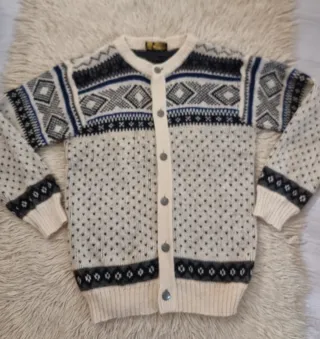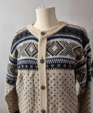 Cardigan vintage uomo/unisex in pura lana con classico design norvegese. Articolo acquistato in Norvegia, qualità eccellente Perfetto stato - Motivo a rombi e puntini. - Bordi a costine. - Chiusura con bottoni in metallo lavorato - Misure in foto