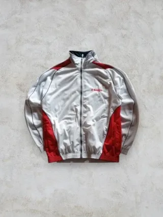 Giacca sportiva stile Y2K con logo Nike e scritta USA. - Zip frontale. - Inserti rossi e neri sulle maniche. - Dettagli a righe sulle maniche e sul colletto.
