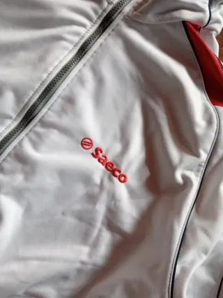 Felpa vintage Saeco da uomo con zip frontale. Presenta inserti rossi sui fianchi e sulle spalle, con dettagli neri. - Zip frontale. - Inserti rossi - Scritta I FEEL SAECO sul retro
