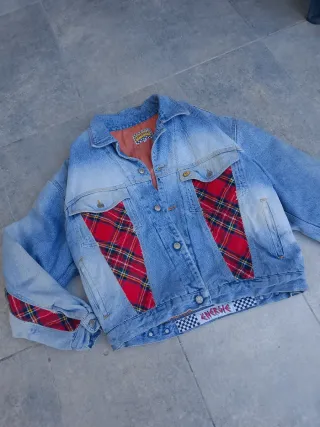 Iconico giubbotto in denim Energie, un vero pezzo da collezione degli anni '90. - Patch in tessuto scozzese rosso. - Dettagli a quadri sul fondo. - Interno foderato.