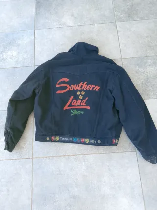 Iconico giubbotto in stile paninaro degli anni '90, con una grafica distintiva sul retro. - Scritta Southern Land con dettagli ricamati. - Immagine di un drago e corone. - Bordatura inferiore con stemmi colorati. - Chiusura con bottoni. - Maniche lunghe con polsini. - Colletto classico.