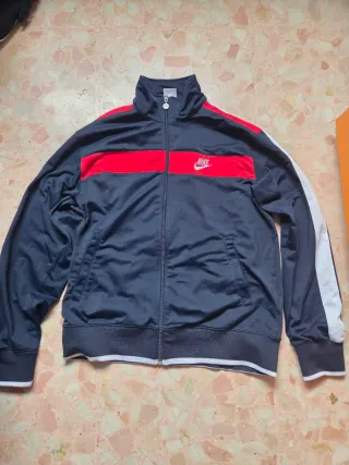 Vendo giacca da pista Nike vintage in poliestere blu scuro con strisce rosse e bianche, poiché I'avevo comprata quando ero piccolo e ormai non mi entra più. Particolare zip in vecchio stile nike. Condizioni come da foto, se necessitate di ulteriori foto non esitate a chiedere.