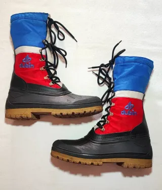 Dubin storico brand italiano specializzato per l'abbigliamento sci,doposci vintage "France edition" non eccessivamente pesanti,leggeri ma nello stesso tempo caldi, comodissimi con imbottitura protettiva e isolante,doppia chiusura con lacci,taglia 39/40 come da marchiatura sul battistrada - allacciatura con lacci neri. - Parte superiore in tessuto impermeabile - Parte anteriore in gomma resistente - Linguetta post in pelle - logo Dubin lateralmente - Made in Italy
