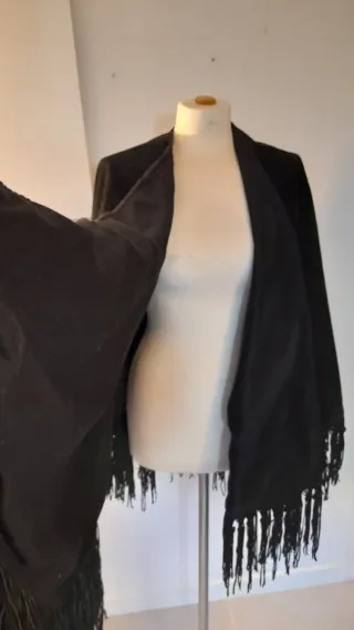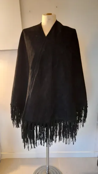 Capo vintage autentico firmato Sem Vaccaro, elegante e senza tempo. Mantella realizzata in tessuto nero, pelle scamosciata, con linea avvolgente. Le frange lunghe sul fondo e sui polsi donano movimento e carattere, richiamando uno stile bohémien raffinato..o scenico e super vintage, perfetto sia su outfit minimal che su look più artistici o anche molto eleganti. Misure parte superiore del tessuto senza frange: 85cm Invernale, foderato e senza difetti. È stato usato un paio di volte ma sembra nuovo, nessun difetto. Può andare bene per più taglie, dalla 40 alla 46. Un pezzo unico. Ideale per chi ama il vintage di qualità.