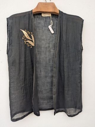 Misure in piano: Torace 53 cm circa Lunghezza 59 cm circa. Coprispalle vintage smanicato, taglia L, in tessuto di puro lino, nero con applicazioni oro davanti, brand GENNY. #Genny #Gennyvintage #linen #purelinen #shrug #vintageshrug #linenshrug #gennyshrug #gennylinen