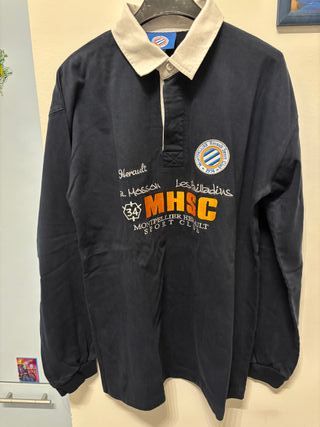 Maglia da rugby vintage del Montpellier HSC, con logo e scritte. - Colore blu scuro. - Maniche lunghe. - Collo a contrasto.