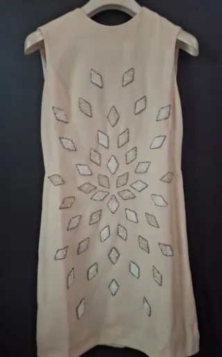 Elegante vestitino vintage con una splendida decorazione. In pura lana vergine - Motivo a rombi con perline. - Perline in due tonalità per un effetto sfumato. - Senza maniche.