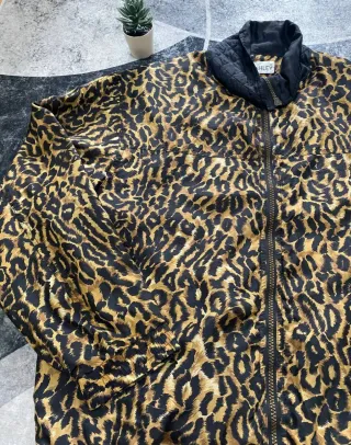 Giacca bomber stile vintage con una audace stampa animalier. Pura seta - Design unico anni '90. - Colletto trapuntato nero. - Zip frontale. - Tasche laterali. - Polsini e fondo elasticizzati.