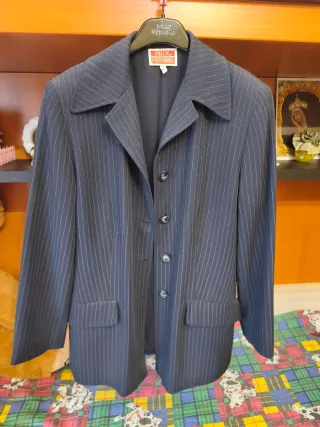 Vendo giacca sartoriale vintage firmata Egon von Fürstenberg, linea Talex. Un classico senza tempo del Made in Italy, perfetta per un look elegante o per uno stile dandy/office chic. Colore: Blu scuro/Nero con sottile gessatura bianca. Taglia: 48. Composizione: Pregiato misto lana (55% Poliestere, 45% Lana) che garantisce ottima tenuta della piega e calore. Fodera interna 100% poliestere. Dettagli: Chiusura a 4 bottoni, tasche anteriori con pattina, taglio strutturato con spalline leggere. Condizioni: Ottime condizioni vintage, ben conservata. Produzione: Made in Italy. Perfetta da indossare oversize o regular.