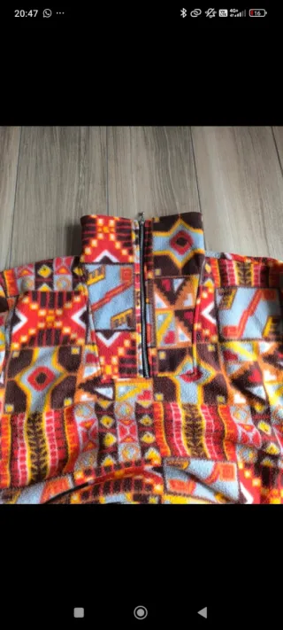 Pile vintage con una fantasía geométrica de estilo Azteca. - Diseño multicolor con predominio de tonos naranjas. - Tejido suave y cálido. - Cuello alto con media cremallera.