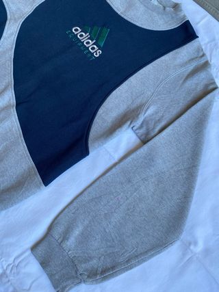 Felpa vintage Adidas Equipment EQT degli anni '90. Un capo iconico con un design unico. - Patch logo Adidas Equipment sul petto. - Pannelli a contrasto blu e grigio. - Maniche lunghe con polsini elasticizzati.