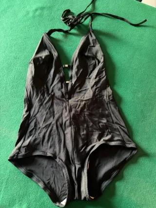 Costume intero vintage dal design unico. - Scollo a V profondo. - Dettagli metallici sul davanti. - Spalline con laccetti regolabili.