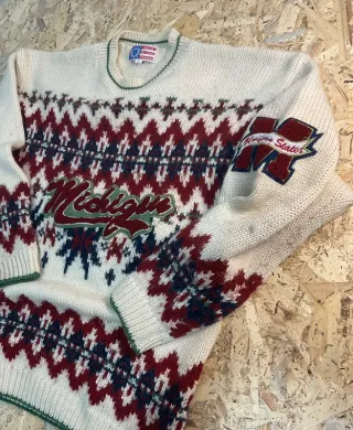 Maglione vintage con un design a rombi e scritte. - Motivo a rombi multicolore. - Scritta Michigan sul davanti. - Logo Michigan State sulla manica.