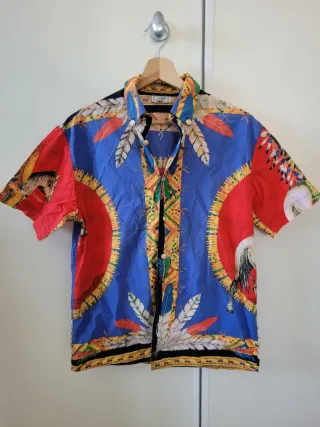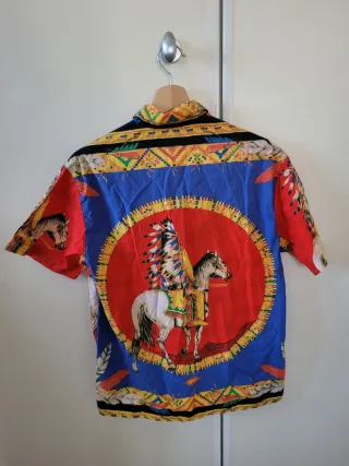 Gianni Versace Native Indian Horse Narrior Couture Gold Red Italian Medusa Baroque Cotton Vintage unisex Camicia a maniche corte Taglia 38 Ottime condizioni Una piccola cucitura al penultimo bottone non visibile quando si abbottona (visibile in fotografia)