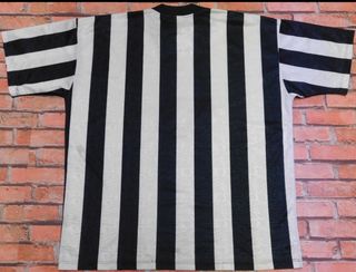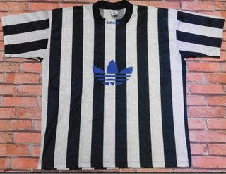 Maglia vintage Adidas con logo Trefoil, prodotta nel Regno Unito. - Design a righe bianche e nere. - Logo Adidas Trefoil blu sul petto.