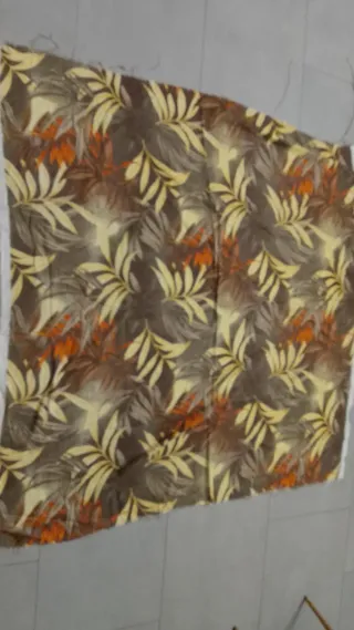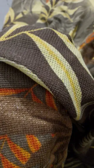 Tessuto vintage con un motivo a floreale. - Misure: 150x150 cm. - Composizione: misto cotone , tela - Fantasia: righe marroni e gialle alternate a motivi floreali arancioni e gialli su fondo marrone.