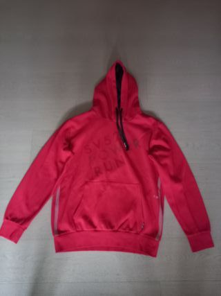 Felpa sportiva Nike dal design vintage, perfetta per un look casual. - Colore blu con banda orizzontale rossa. - Dettagli rossi sulle maniche. - Logo Nike ricamato sul petto. in certi punti è un po scolorita