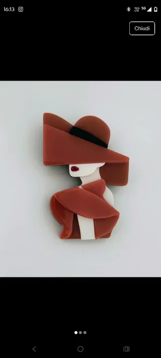 Spilla a forma di donna con un elegante cappello rosso e un abito svolazzante. Un accessorio unico che aggiunge un tocco di classe. - Design stilizzato di una figura femminile. - Dettagli curati nel cappello e nell'abbigliamento.
