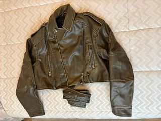Giacca in ecopelle effetto used, dal taglio corto e moderno. - Chiusura con zip asimmetrica. - Tasche frontali con zip. - Dettagli sulle spalle e sui gomiti. - Cintura in vita rimovibile con fibbie.