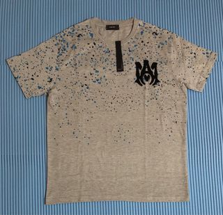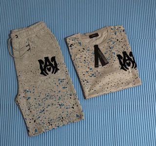Completo estivo Amiri composto da maglia e pantaloncini corti. - Fantasia a schizzi grigi, neri e blu. - Logo Amiri nero sul pantaloncino e sulla maglia.