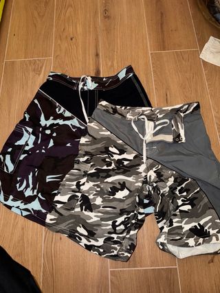 Lotto composto da due costumi da bagno da uomo. - Fantasia camouflage grigia e nera. - Fantasia camouflage blu e nera. - Coulisse in vita per regolare la vestibilità. - larghezza 37 cm - lunghezza 50 cm