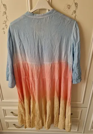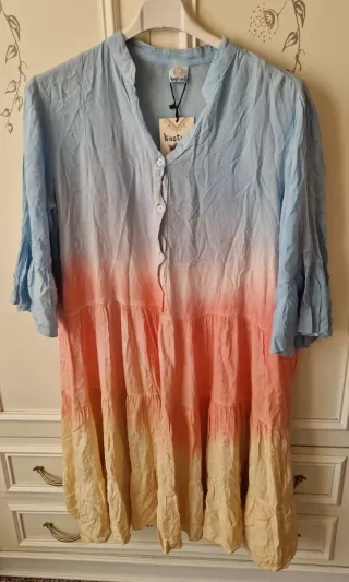 Copricostume da donna con un bellissimo effetto tie-dye sfumato. 100x100 viscosa Lunghezza cm 104 da ascella ad ascella cm 58 larghezza spalle cm 48 - Maniche a campana. - Collo alla coreana. - Chiusura con bottoncini sul davanti. - Gonna a balze.