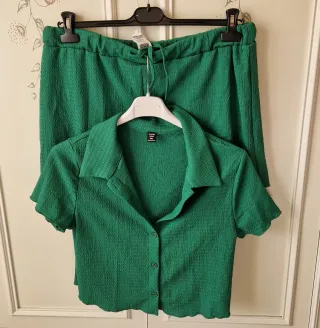 Completo estivo composto da top e gonna. Poliestere elastico Maglietta Lunghezza cm 46 da ascella ad ascella cm 48 larghezza spalle cm 42 Pantaloncini Lunghezza cm 38 vita cm 46 - Tessuto leggermente testurizzato. - Top con colletto e chiusura a bottoni. - Gonna con elastico in vita e coulisse.