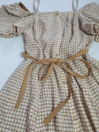 Vestido midi con estampado de cuadros en tonos beige y blanco. Presenta un diseño con tirantes finos y mangas abullonadas.Le misure sono nelle foto.Manca in bottone. - Estampado de cuadros. - Detalle de lazada en la cintura. - Cierre de botones en la parte delantera.