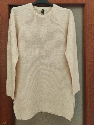 Maglione lungo con un design a blocchi di colore. La trama a maglia lo rende un capo caldo e confortevole. - Maniche lunghe. - Girocollo. - Lunghezza al ginocchio.