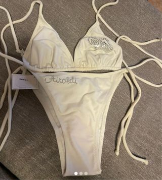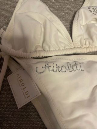 Bikini Airoldi bianco con dettagli scintillanti. - Top a triangolo con paillettes. - Slip con logo Airoldi ricamato. - Laccetti regolabili. Taglia S Taglia M Prezzo cad. uno Si può acquistare anche il Cappellino, chiedi pure se ti piace.